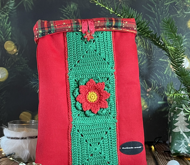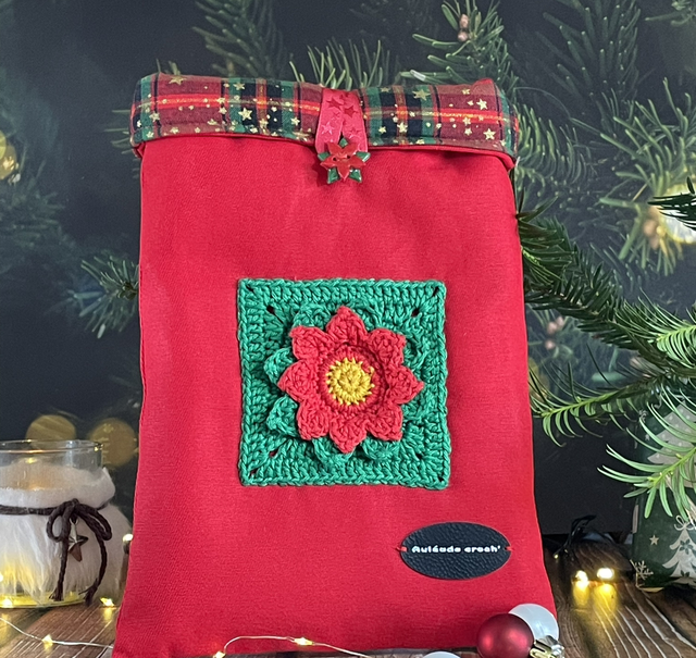 Sergé rouge, granny coton éthique, tartan à étoiles dorées, ruban étoilé, bouton polymère, étoile crochetée.