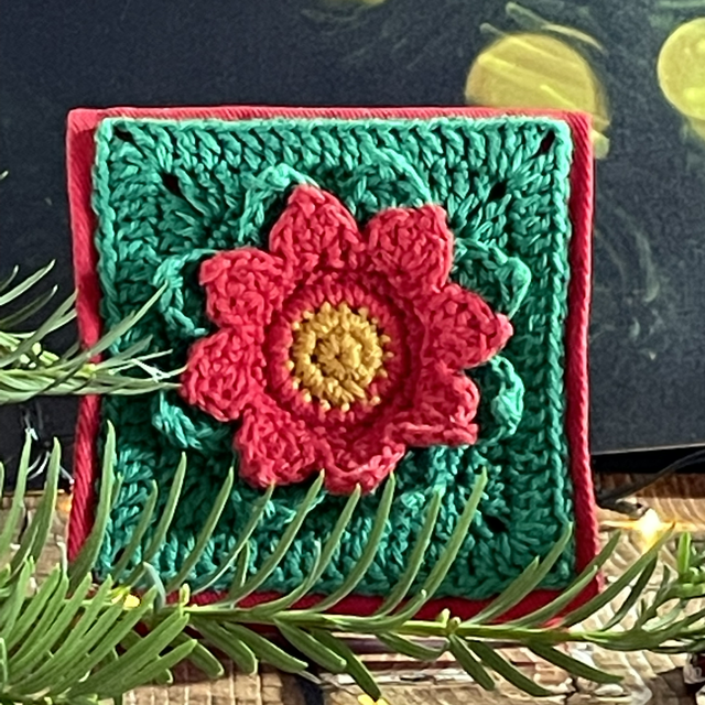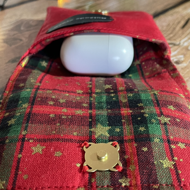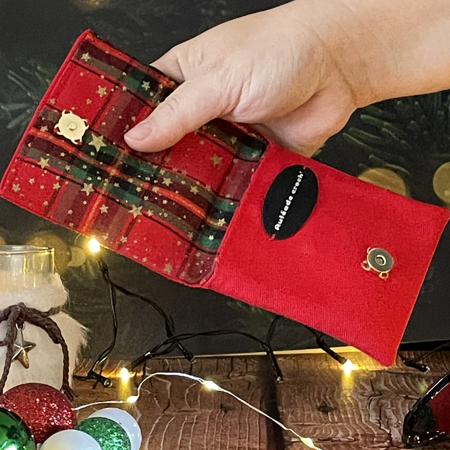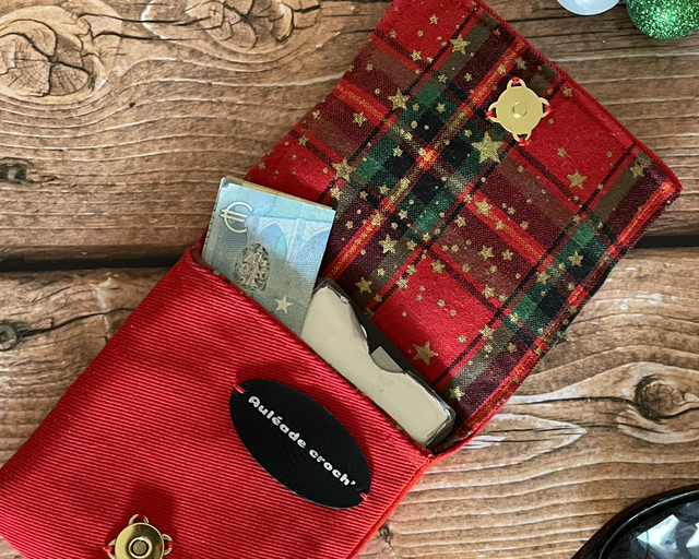 Petite, douce et festive, la mini pochette Tiny Spirit garde précieusement monnaie, bijoux, cartes ou écouteurs. Réalisée en sergé rouge et doublée d’un tartan rouge et vert étoilé doré pailleté, elle mêle chaleur et magie. Son rabat en carré granny fait main apportent une touche artisanale et lumineux.